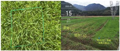 1.4 試驗(yàn)設(shè)計(jì):試驗(yàn)設(shè)每畝愛秀100ml、150 ml,愛秀·氯氟吡氧乙酸混劑160 ml、145 ml、130 ml,愛秀100 ml+氯氟吡氧乙酸60 ml,驃馬100 ml+氯氟吡氧乙酸60 ml兌水30L電動(dòng)噴霧器噴霧;愛秀·氯氟吡氧乙酸160 ml,愛秀100 ml+氯氟吡氧乙酸60 ml,驃馬100 ml+氯氟吡氧乙酸60 ml兌水1.2L無人機(jī)飛防,以及清水空白對(duì)照11個(gè)處理。前8個(gè)噴霧處理(含CK),小區(qū)面積300㎡,后3個(gè)飛防處理,每處理面積6-10畝。噴藥時(shí)間為2022年12月20日,麥苗生育期為3-4葉期。